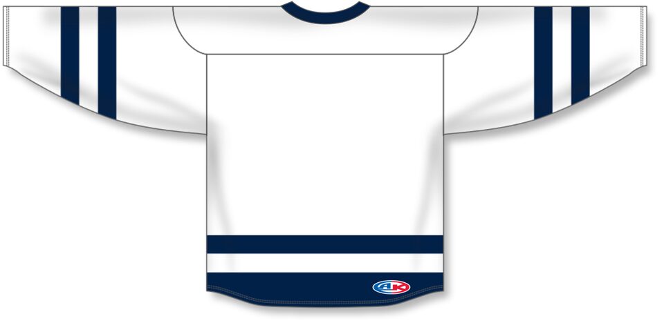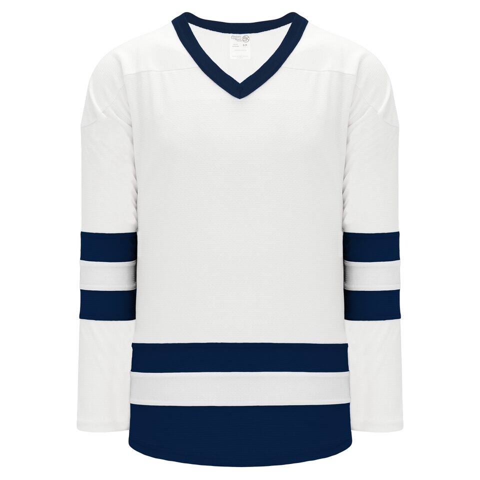The H6500 League Hockey Jersey is made of midweight knit, a midweight polyester knitted fabric that is a lighter version of our AK-Knit fabric with more breathability. This league hockey jersey is white/navy but many other colours are available on our website. It is available in youth & adult sizes.