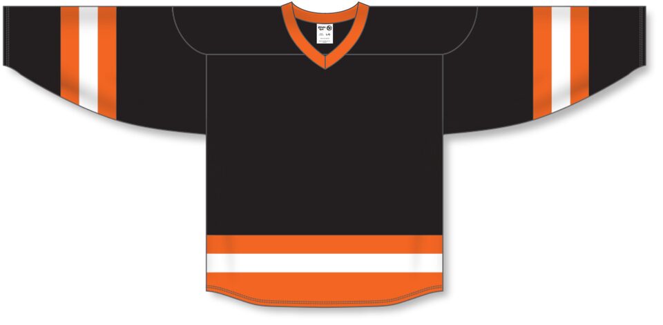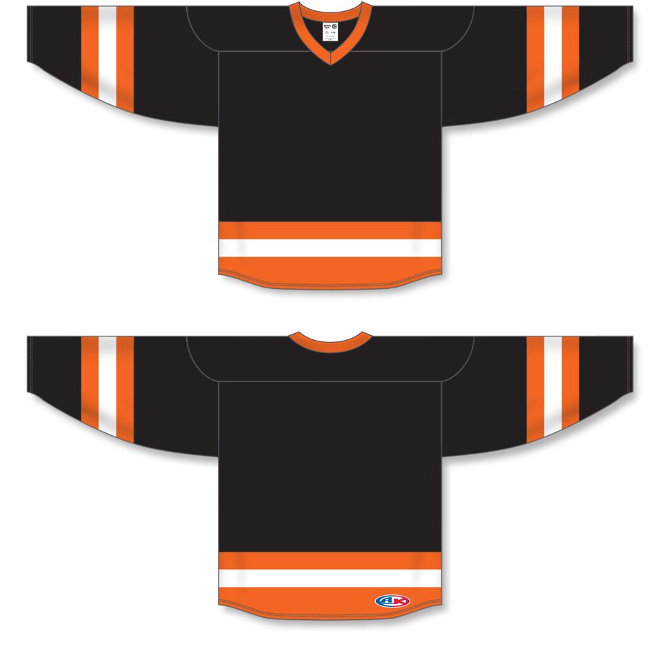 The H6500 League Hockey Jersey is made of midweight knit, a midweight polyester knitted fabric that is a lighter version of our AK-Knit fabric with more breathability. This league hockey jersey is black/orange/white but many other colours are available on our website. It is available in youth & adult sizes.