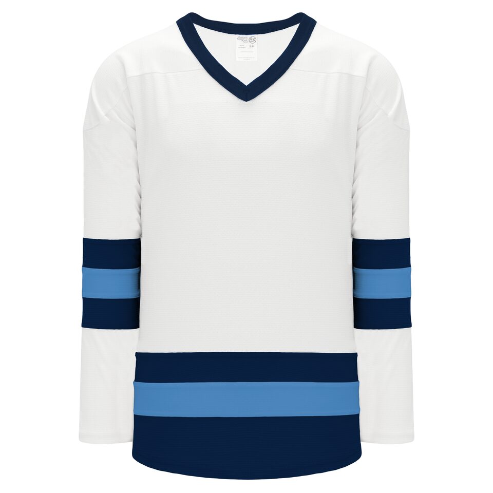 The H6500 League Hockey Jersey is made of midweight knit, a midweight polyester knitted fabric that is a lighter version of our AK-Knit fabric with more breathability. This league hockey jersey is white/navy/sky but many other colours are available on our website. It is available in youth & adult sizes.