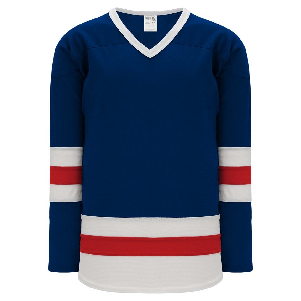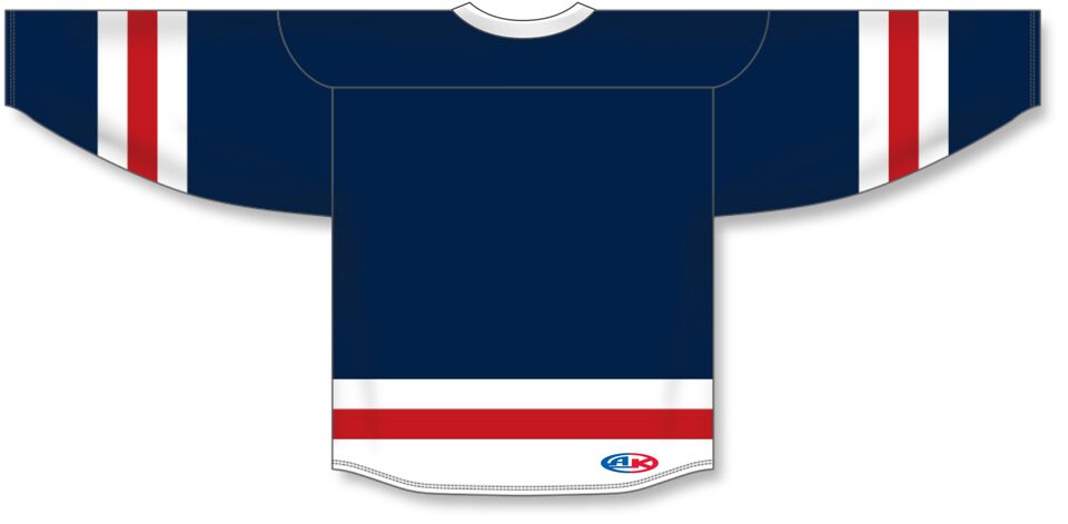 The H6500 League Hockey Jersey is made of midweight knit, a midweight polyester knitted fabric that is a lighter version of our AK-Knit fabric with more breathability. This league hockey jersey is navy/white/red but many other colours are available on our website. It is available in youth & adult sizes.