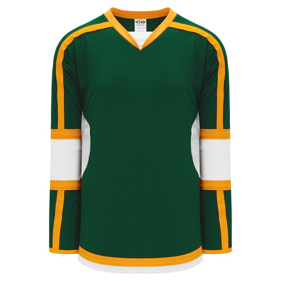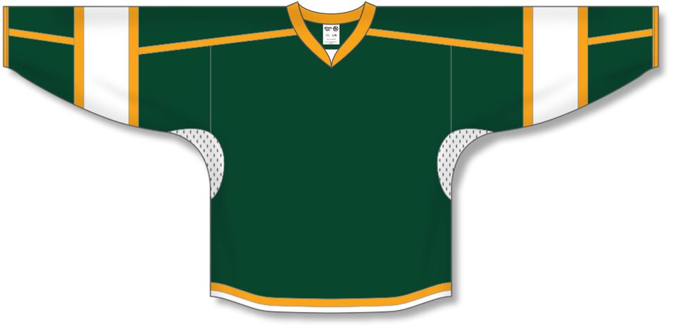 The H7000 Select Hockey Jersey is made of ak-knit, a heavyweight polyester knitted fabric that is extremely durable but still breathes pretty well. This select hockey jersey is dark green/white/gold but many other colours are available on our website. It is available in youth & adult sizes.
