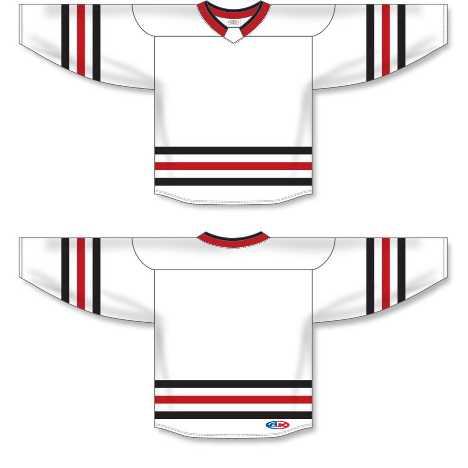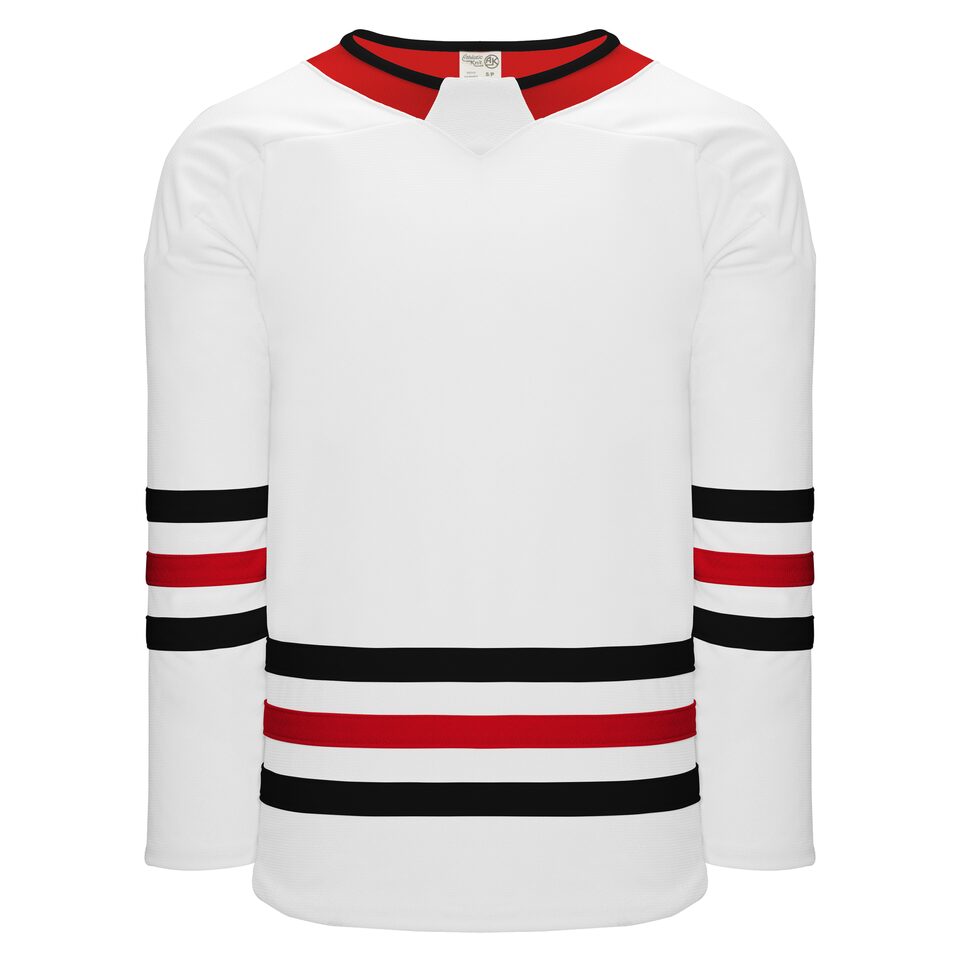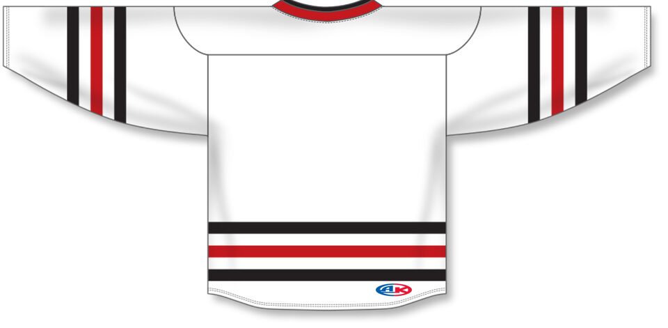 The H8000 Select Hockey Jersey is made of ak-knit, a heavyweight polyester knitted fabric that is extremely durable but still breathes pretty well. This select hockey jersey is white/black/red but many other colours are available on our website. It is available in youth & adult sizes.