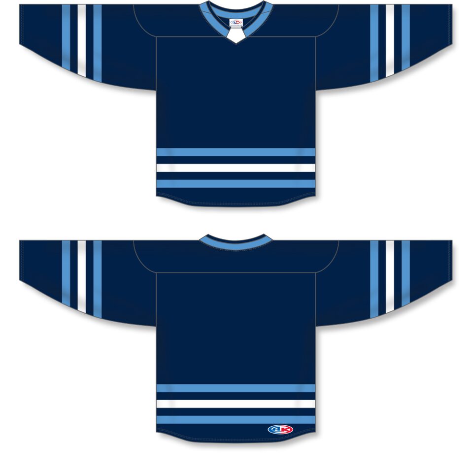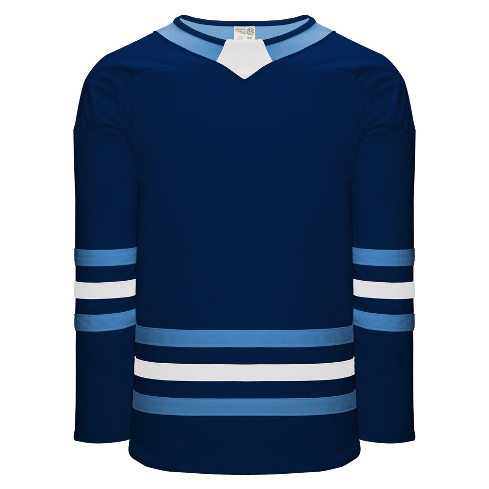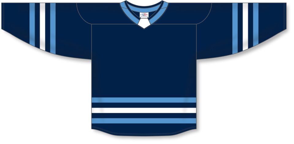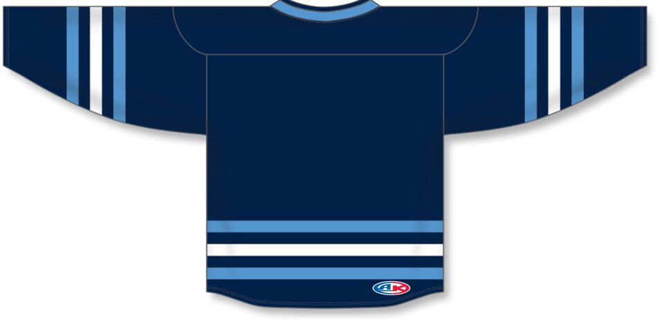 The H8000 Select Hockey Jersey is made of ak-knit, a heavyweight polyester knitted fabric that is extremely durable but still breathes pretty well. This select hockey jersey is navy/sky/white but many other colours are available on our website. It is available in youth & adult sizes.