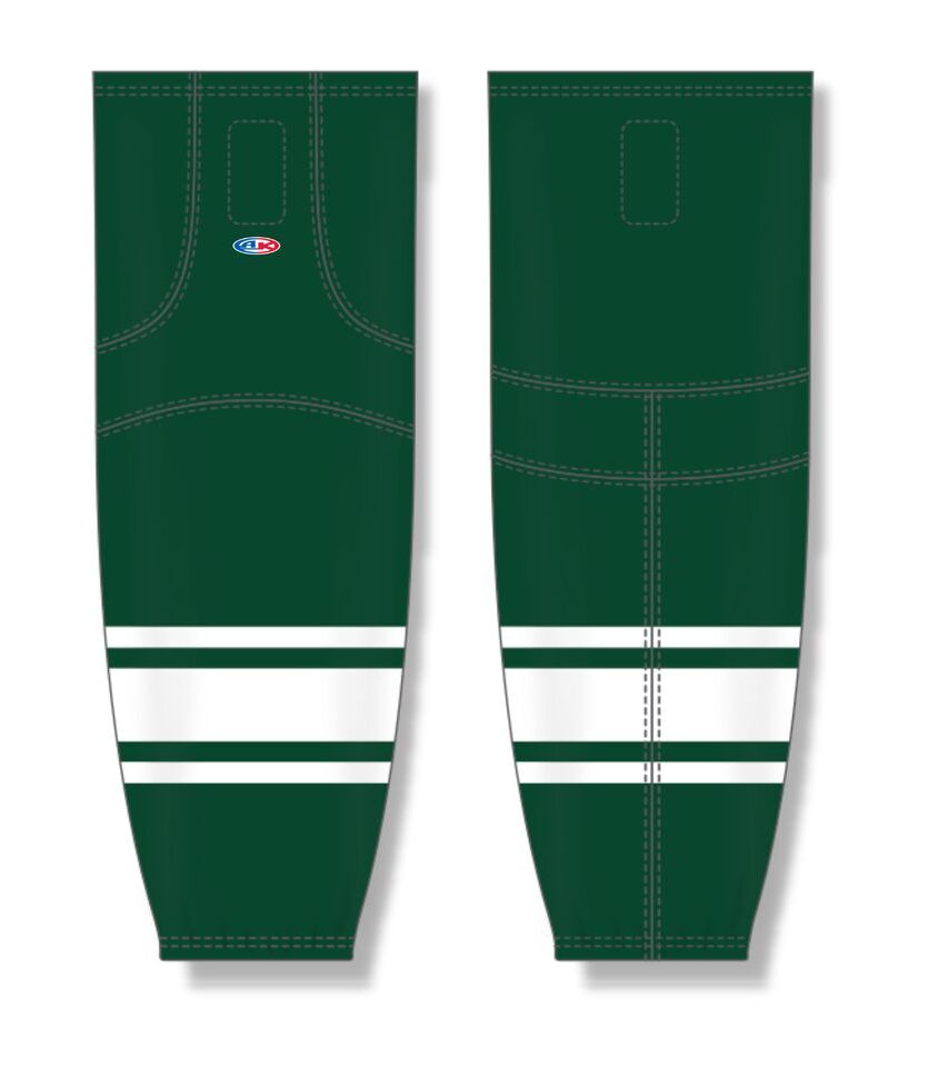 The HS2100 Lightweight Pro Hockey Socks is made of ak-knit, a polyester knitted fabric as well as velcro tabs. These lightweight pro hockey socks are dark green/white but many other colours are available on our website. They are available in youth, intermediate & adult sizes.