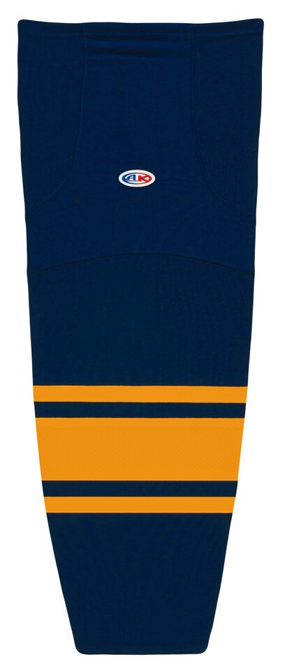The HS2100 Lightweight Pro Hockey Socks is made of ak-knit, a polyester knitted fabric as well as velcro tabs. These lightweight pro hockey socks are navy/tuscan gold but many other colours are available on our website. They are available in youth, intermediate & adult sizes.