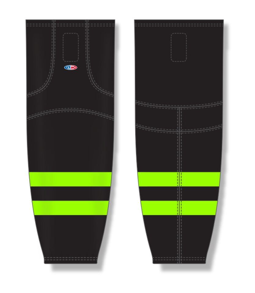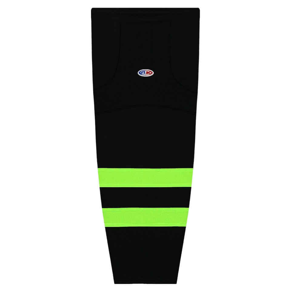 The HS2100 Lightweight Pro Hockey Socks is made of ak-knit, a polyester knitted fabric as well as velcro tabs. These lightweight pro hockey socks are 2021 dallas black/neon green but many other colours are available on our website. They are available in youth, intermediate & adult sizes.