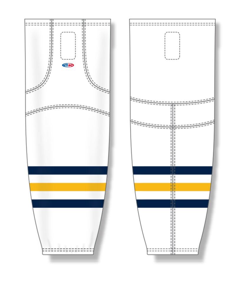 The HS2100 Lightweight Pro Hockey Socks is made of ak-knit, a polyester knitted fabric as well as velcro tabs. These lightweight pro hockey socks are white/navy/tuscan gold but many other colours are available on our website. They are available in youth, intermediate & adult sizes.