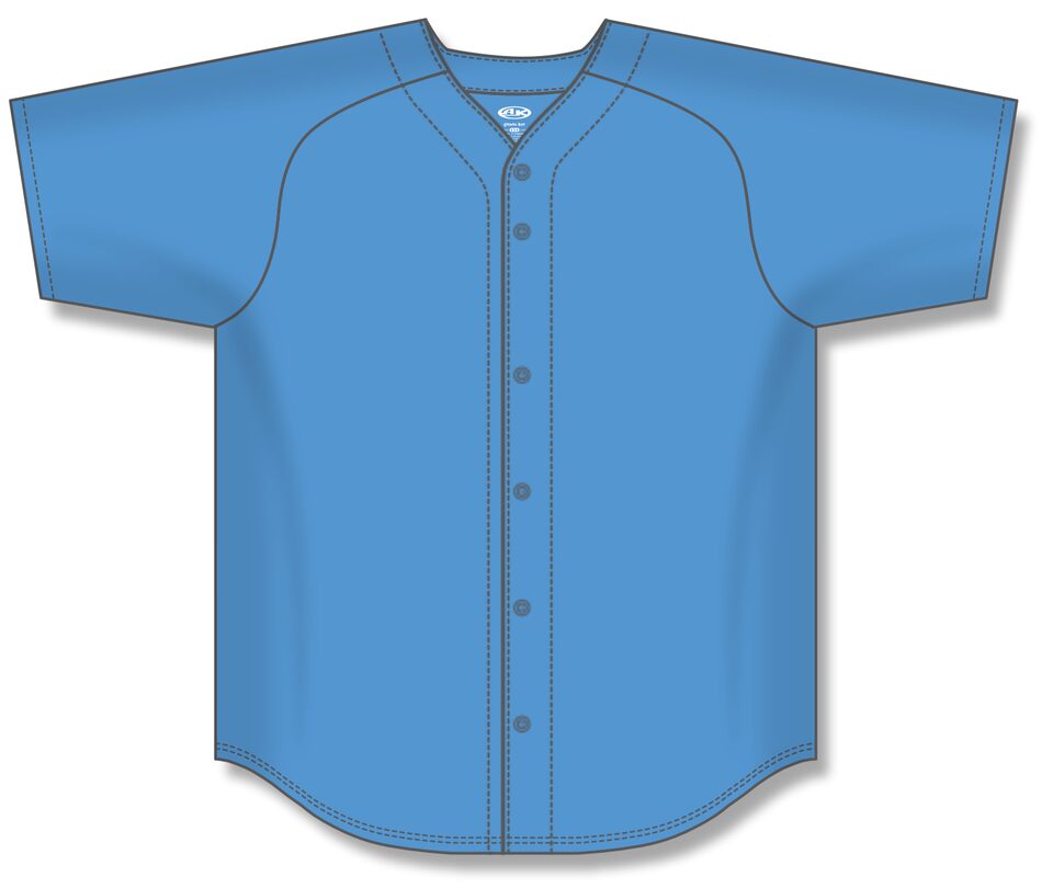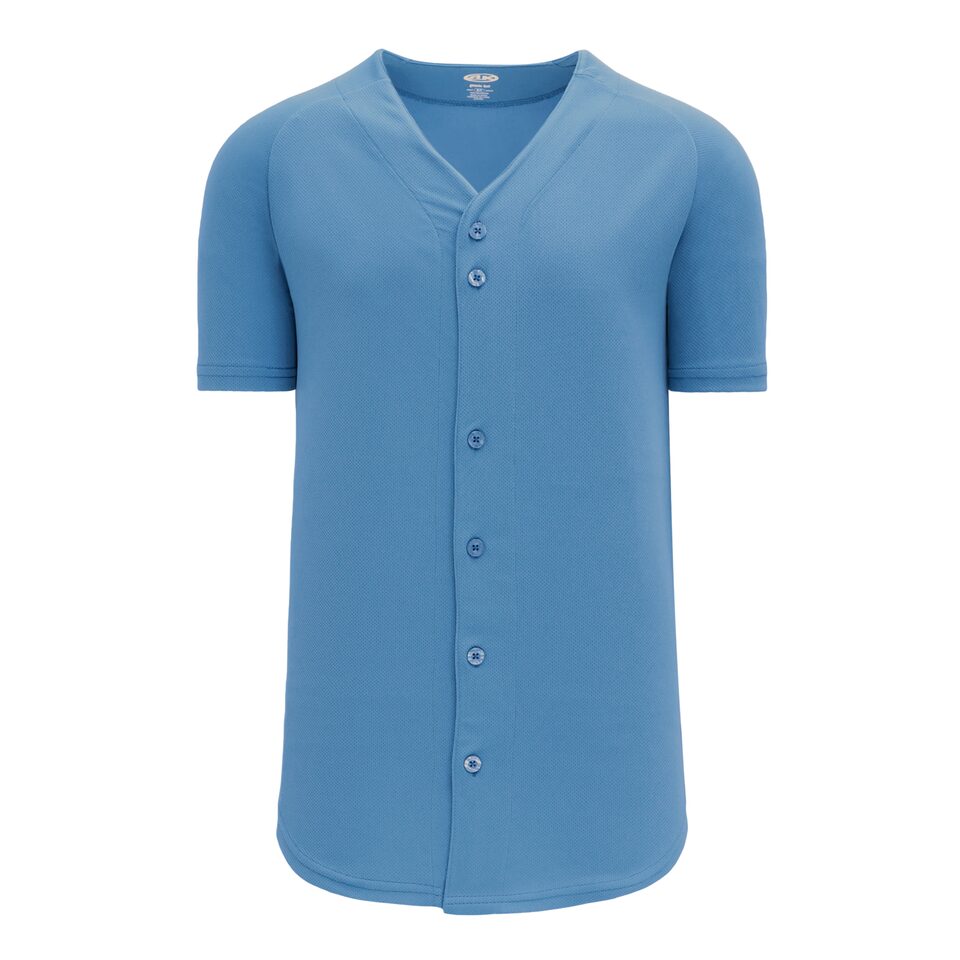 The BA5200 Full Button Baseball Jersey is made of moisture wicking proflex, a polyester moisture wicking knitted fabric constructed with aeration for breathability and mild stretch, it is very durable and comfortable to wear. This full button baseball jersey is sky but many other colours are available on our website. It is available in youth, women's & men's sizes.