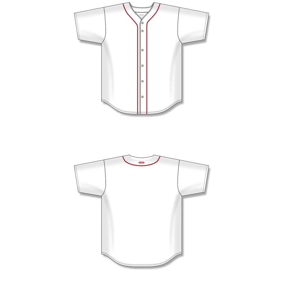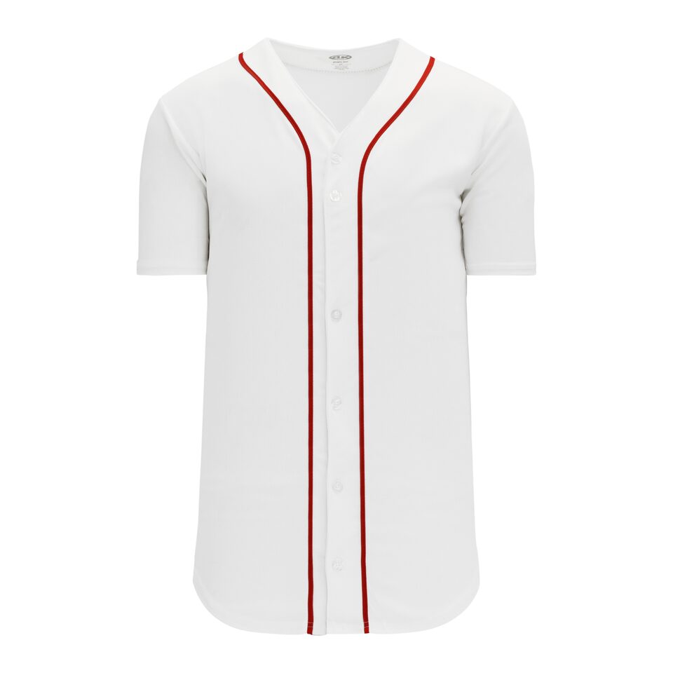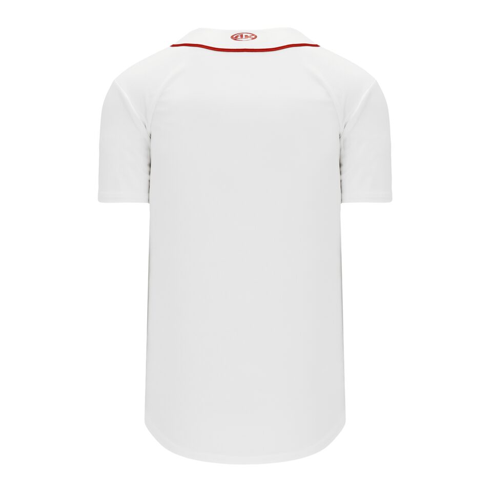 The BA5500 Full Button Baseball Jersey is made of moisture wicking proflex, a polyester moisture wicking knitted fabric constructed with aeration for breathability and mild stretch, it is very durable and comfortable to wear. This full button baseball jersey is white/red but many other colours are available on our website. It is available in youth & men's sizes.