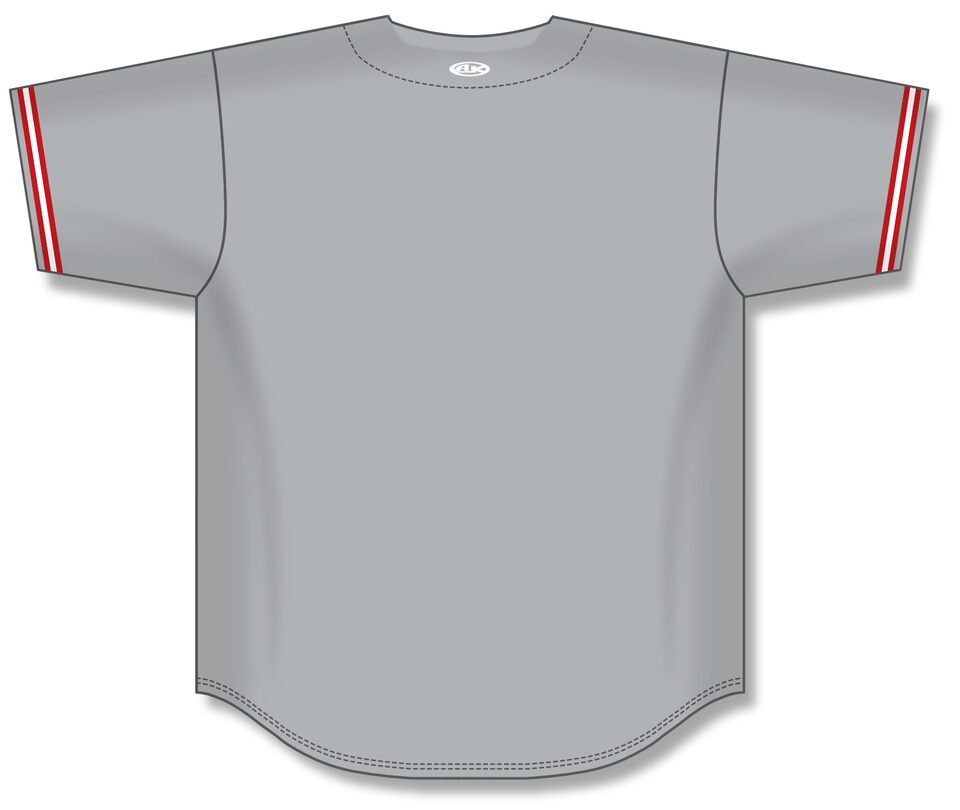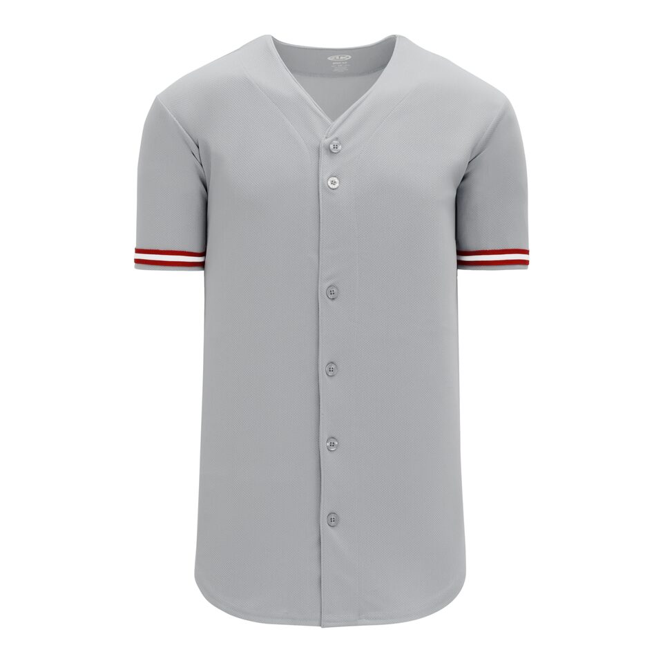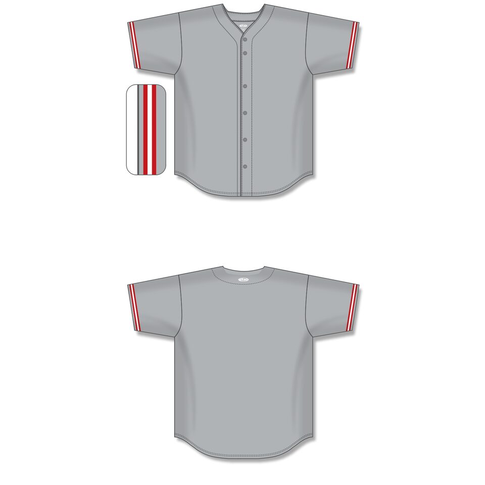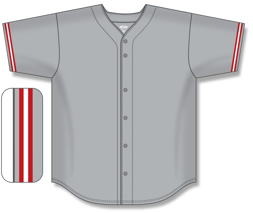 The BA5500 Full Button Baseball Jersey is made of moisture wicking proflex, a polyester moisture wicking knitted fabric constructed with aeration for breathability and mild stretch, it is very durable and comfortable to wear. This full button baseball jersey is grey/red/white but many other colours are available on our website. It is available in youth & men's sizes.