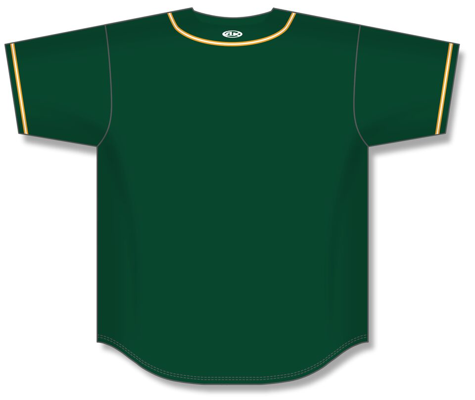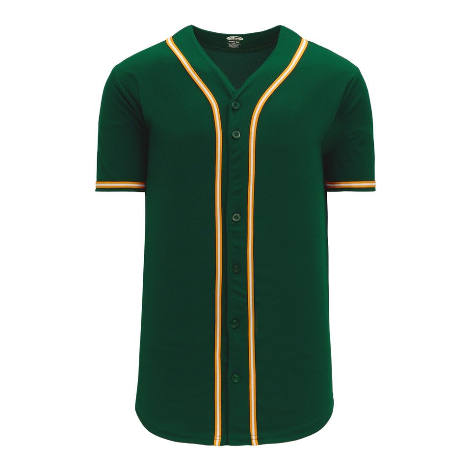 The BA5500 Full Button Baseball Jersey is made of moisture wicking proflex, a polyester moisture wicking knitted fabric constructed with aeration for breathability and mild stretch, it is very durable and comfortable to wear. This full button baseball jersey is dark green/gold/white but many other colours are available on our website. It is available in youth & men's sizes.