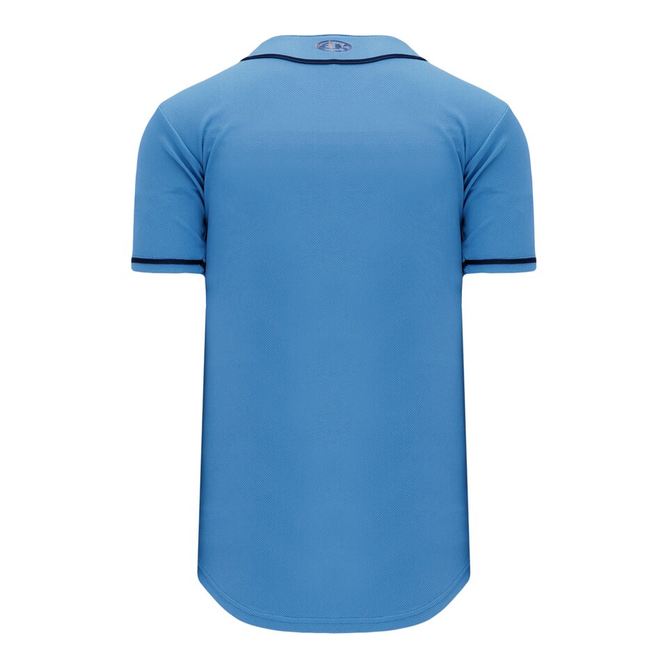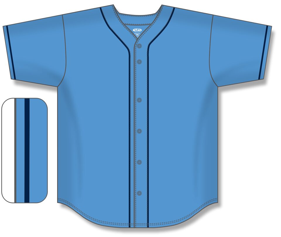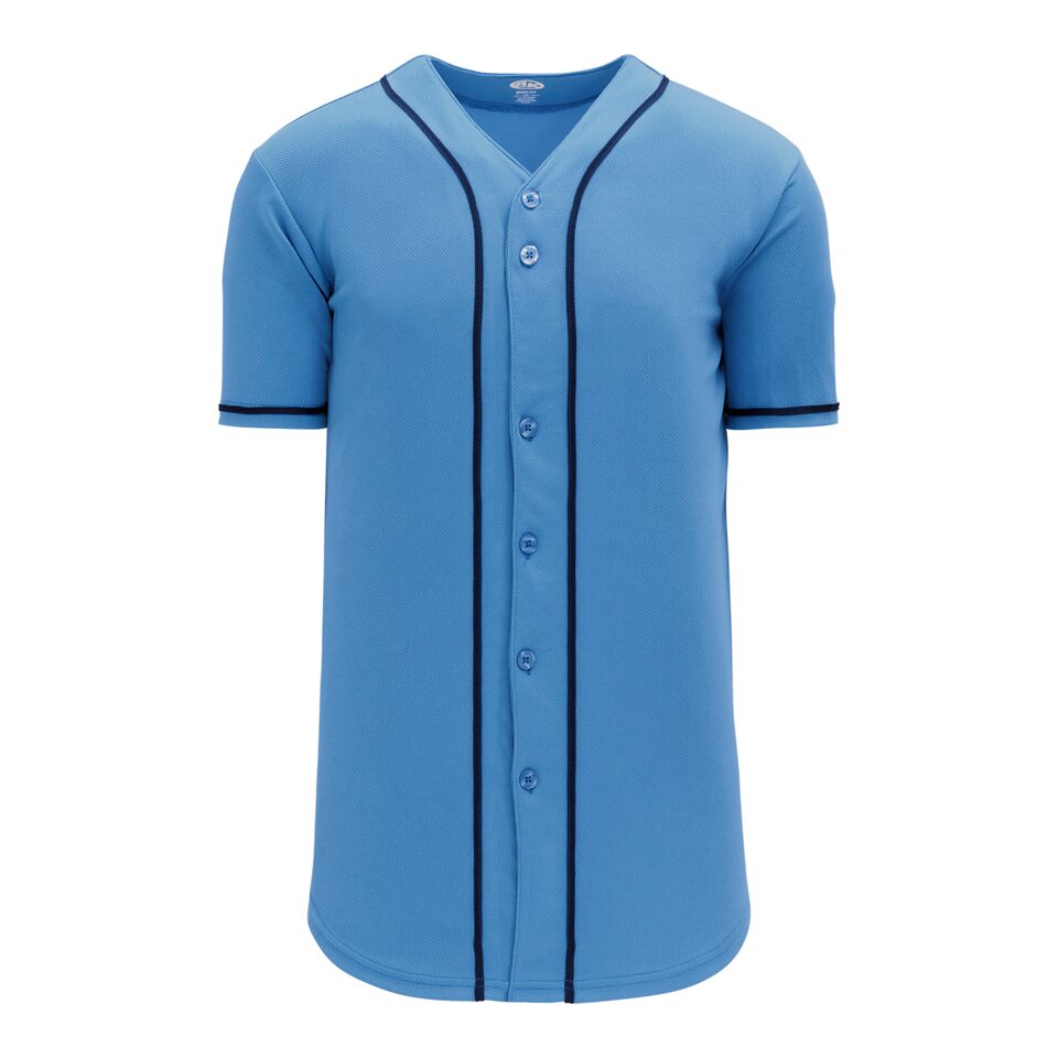 The BA5500 Full Button Baseball Jersey is made of moisture wicking proflex, a polyester moisture wicking knitted fabric constructed with aeration for breathability and mild stretch, it is very durable and comfortable to wear. This full button baseball jersey is sky/navy but many other colours are available on our website. It is available in youth & men's sizes.