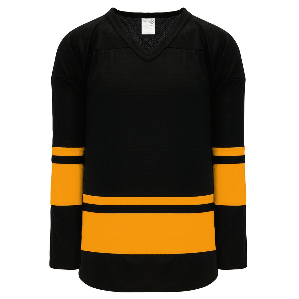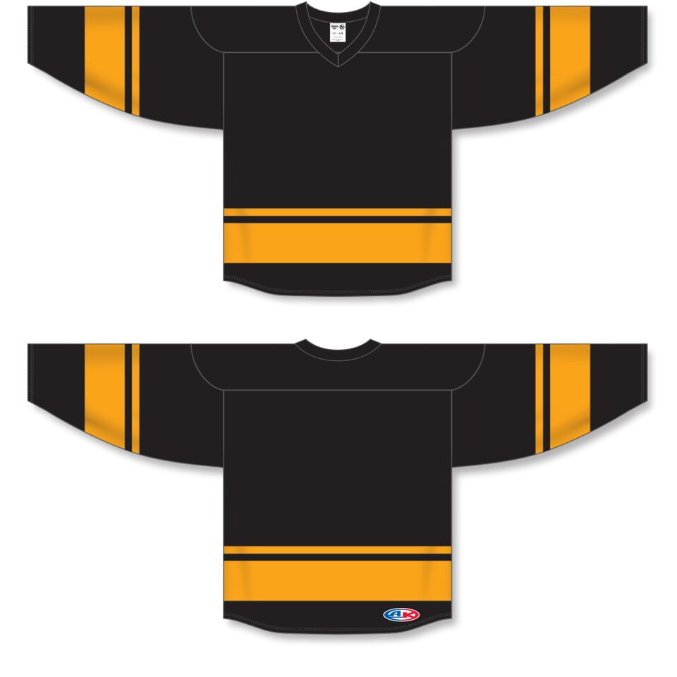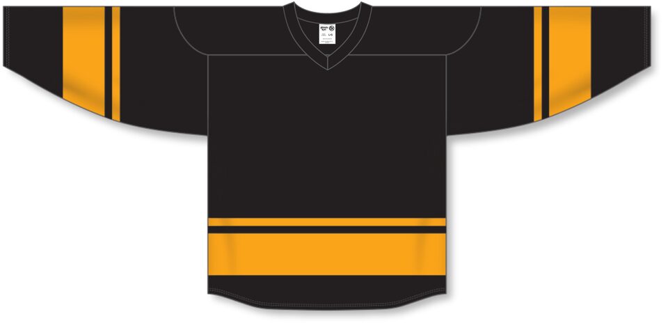 Le chandail de hockey "ligue" H6400 est fait de polyester moyen, un polyester de poids moyen soit une version plus légère de notre tissu AK-Knit. Ce chandail de hockey "ligue" est le noir/or mais plusieurs autres couleurs sont disponibles sur notre site web. Il est disponible dans les grandeurs junior & adulte