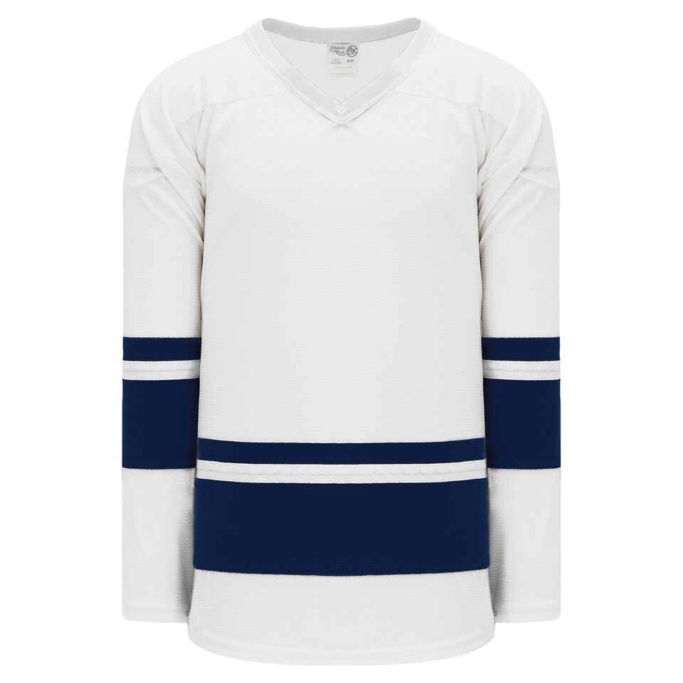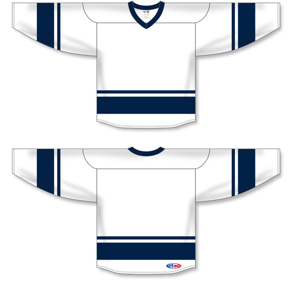 Le chandail de hockey "ligue" H6400 est fait de polyester moyen, un polyester de poids moyen soit une version plus légère de notre tissu AK-Knit. Ce chandail de hockey "ligue" est le blanc/marine mais plusieurs autres couleurs sont disponibles sur notre site web. Il est disponible dans les grandeurs junior & adulte