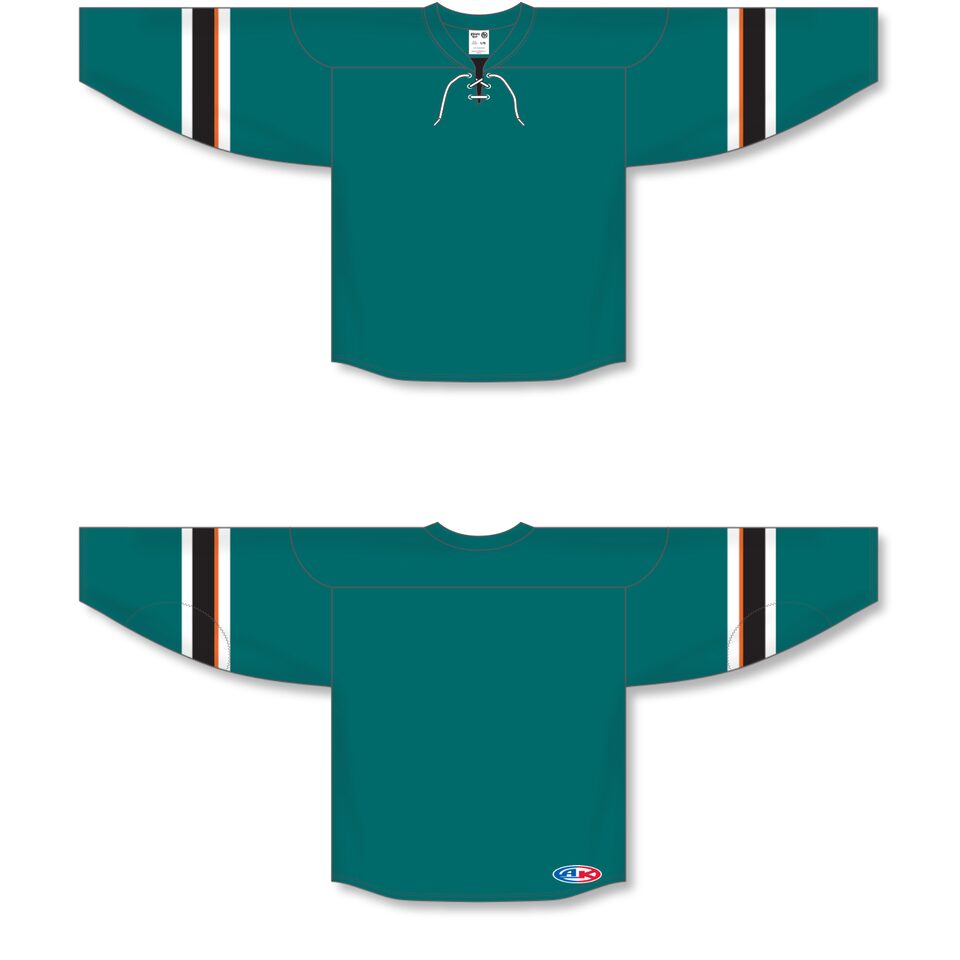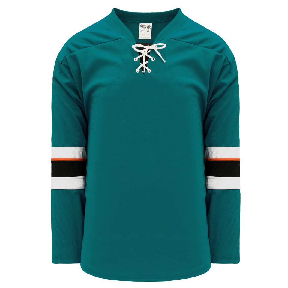 The H550B Pro Hockey Jersey is made of ak-knit, a heavyweight polyester knitted fabric that is extremely durable but still breathes pretty well. This pro hockey jersey is 2013 san jose pacific teal but many other colours are available on our website. It is available in youth & adult sizes.