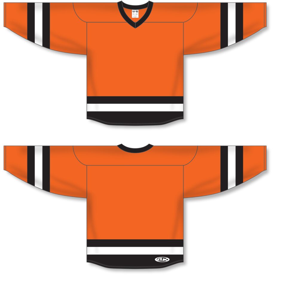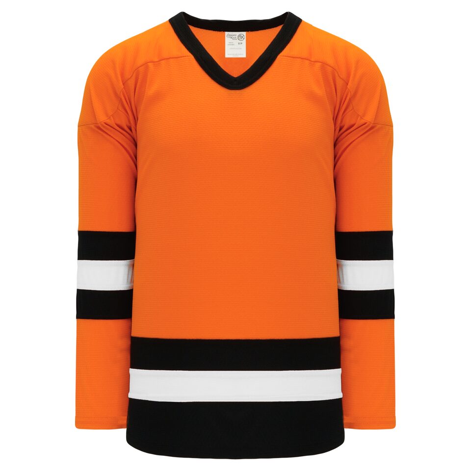The H6500 League Hockey Jersey is made of midweight knit, a midweight polyester knitted fabric that is a lighter version of our AK-Knit fabric with more breathability. This league hockey jersey is orange/black/white but many other colours are available on our website. It is available in youth & adult sizes.