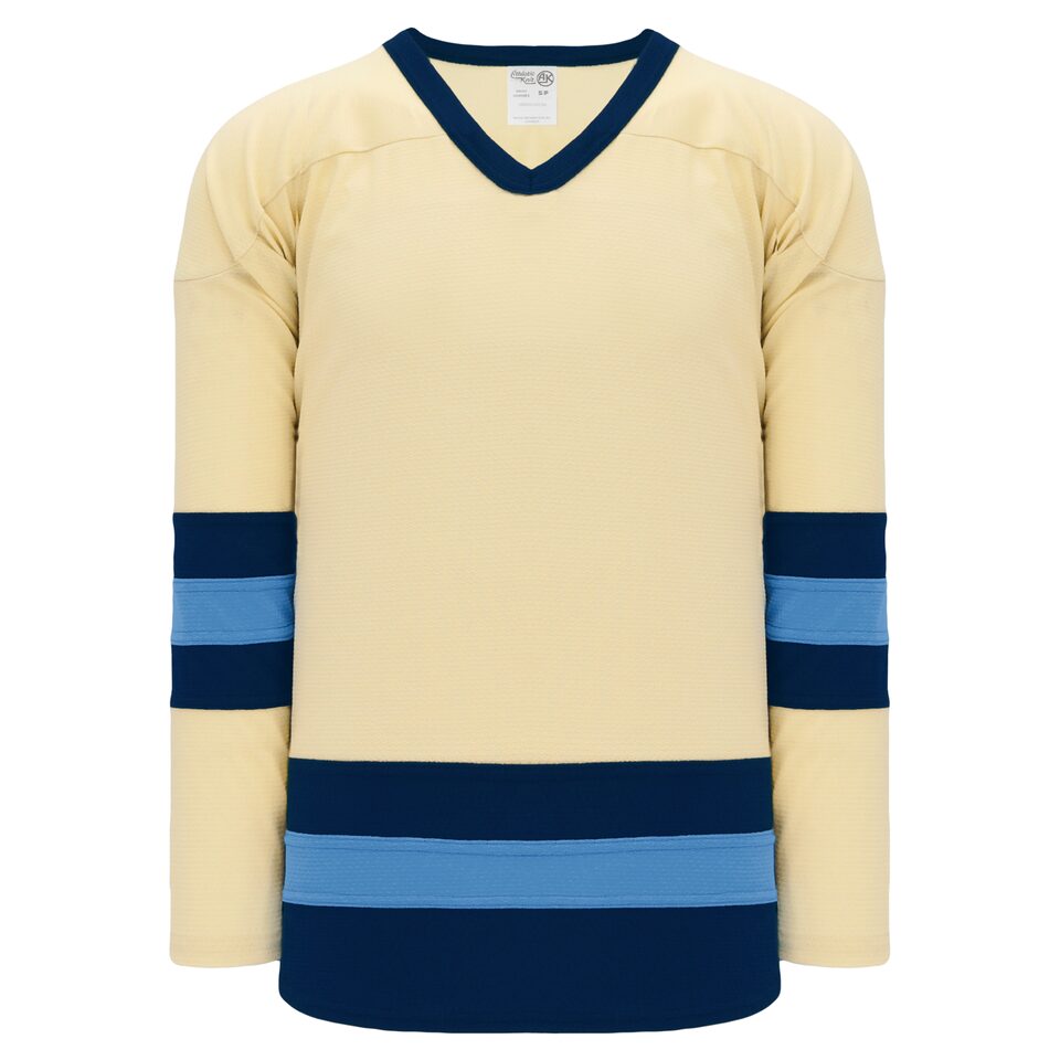 The H6500 League Hockey Jersey is made of midweight knit, a midweight polyester knitted fabric that is a lighter version of our AK-Knit fabric with more breathability. This league hockey jersey is sand/navy/sky but many other colours are available on our website. It is available in youth & adult sizes.