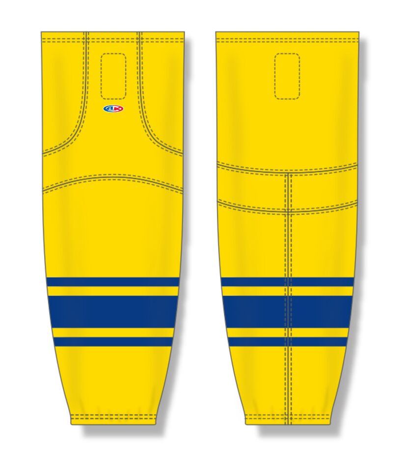 The HS2100 Lightweight Pro Hockey Socks is made of ak-knit, a polyester knitted fabric as well as velcro tabs. These lightweight pro hockey socks are maize/royal but many other colours are available on our website. They are available in youth, intermediate & adult sizes.