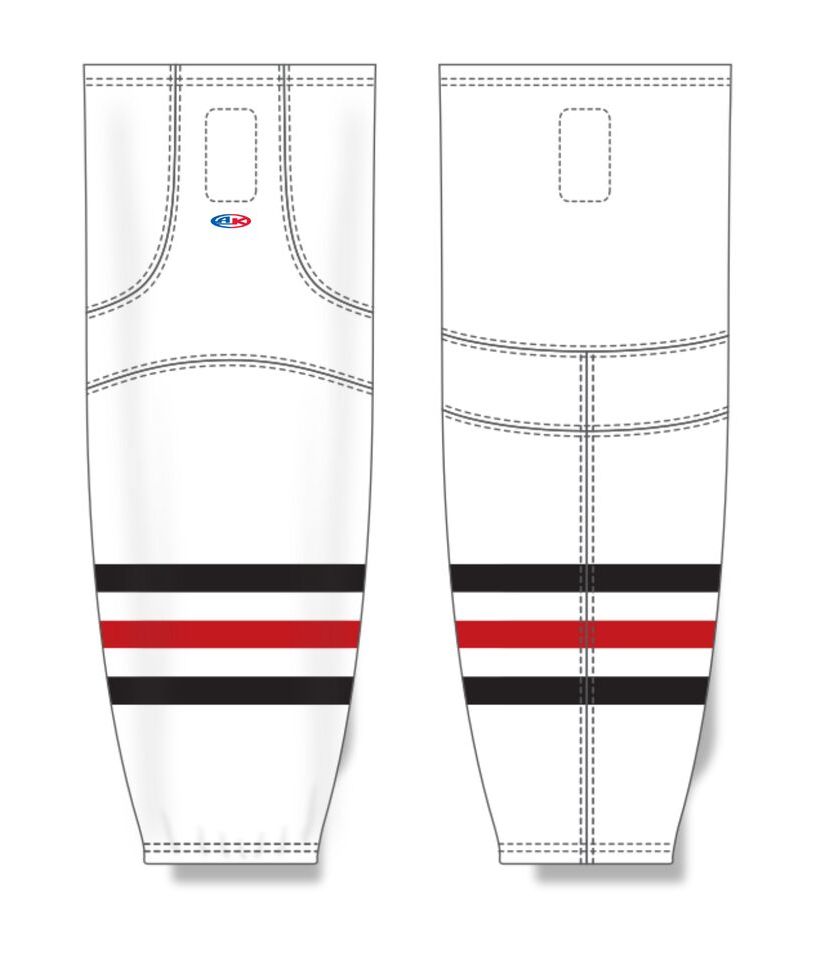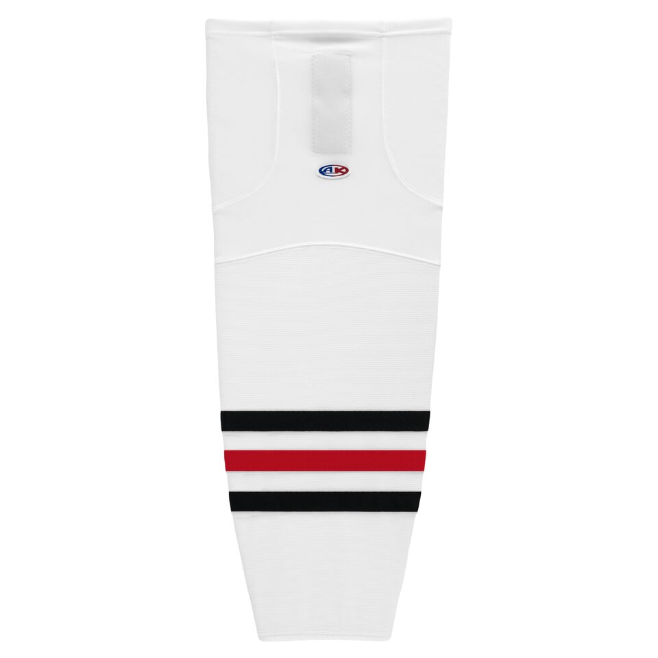 The HS2100 Lightweight Pro Hockey Socks is made of ak-knit, a polyester knitted fabric as well as velcro tabs. These lightweight pro hockey socks are chicago white but many other colours are available on our website. They are available in youth, intermediate & adult sizes.