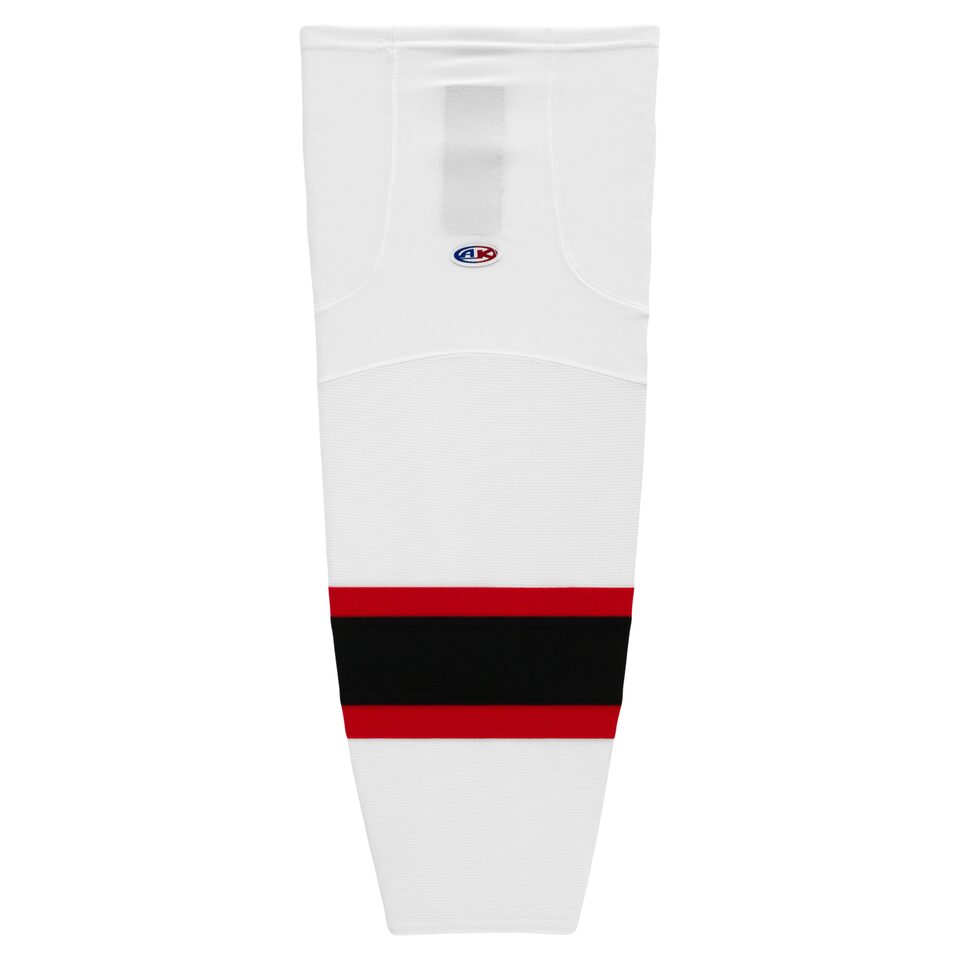 The HS2100 Lightweight Pro Hockey Socks is made of ak-knit, a polyester knitted fabric as well as velcro tabs. These lightweight pro hockey socks are new jersey white but many other colours are available on our website. They are available in youth, intermediate & adult sizes.