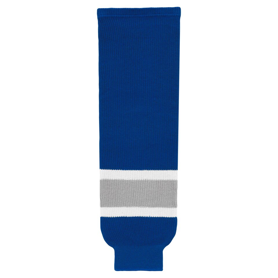 The HS630 Knitted Striped Hockey Socks is made of knitted fabric, for durable hockey socks. These knitted striped hockey socks are royal/grey/white but many other colours are available on our website. They are available in youth, intermediate & adult sizes.