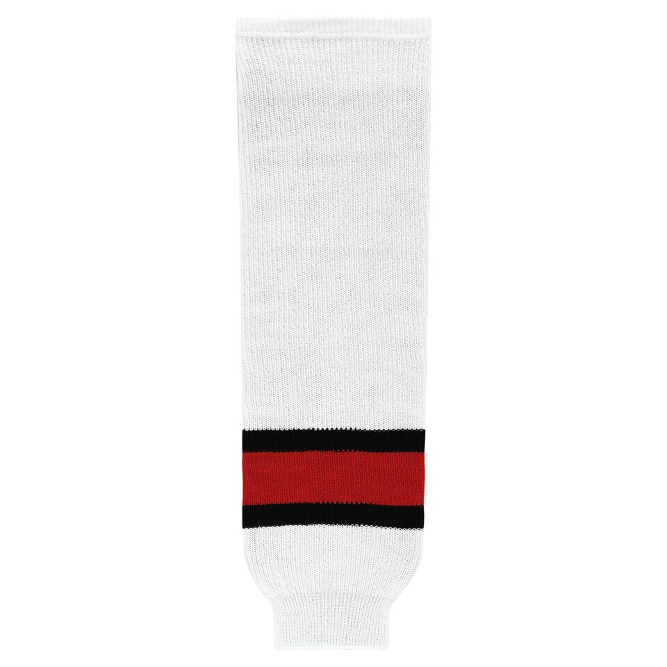 The HS630 Knitted Striped Hockey Socks is made of knitted fabric, for durable hockey socks. These knitted striped hockey socks are 2002 team canada white but many other colours are available on our website. They are available in youth, intermediate & adult sizes.