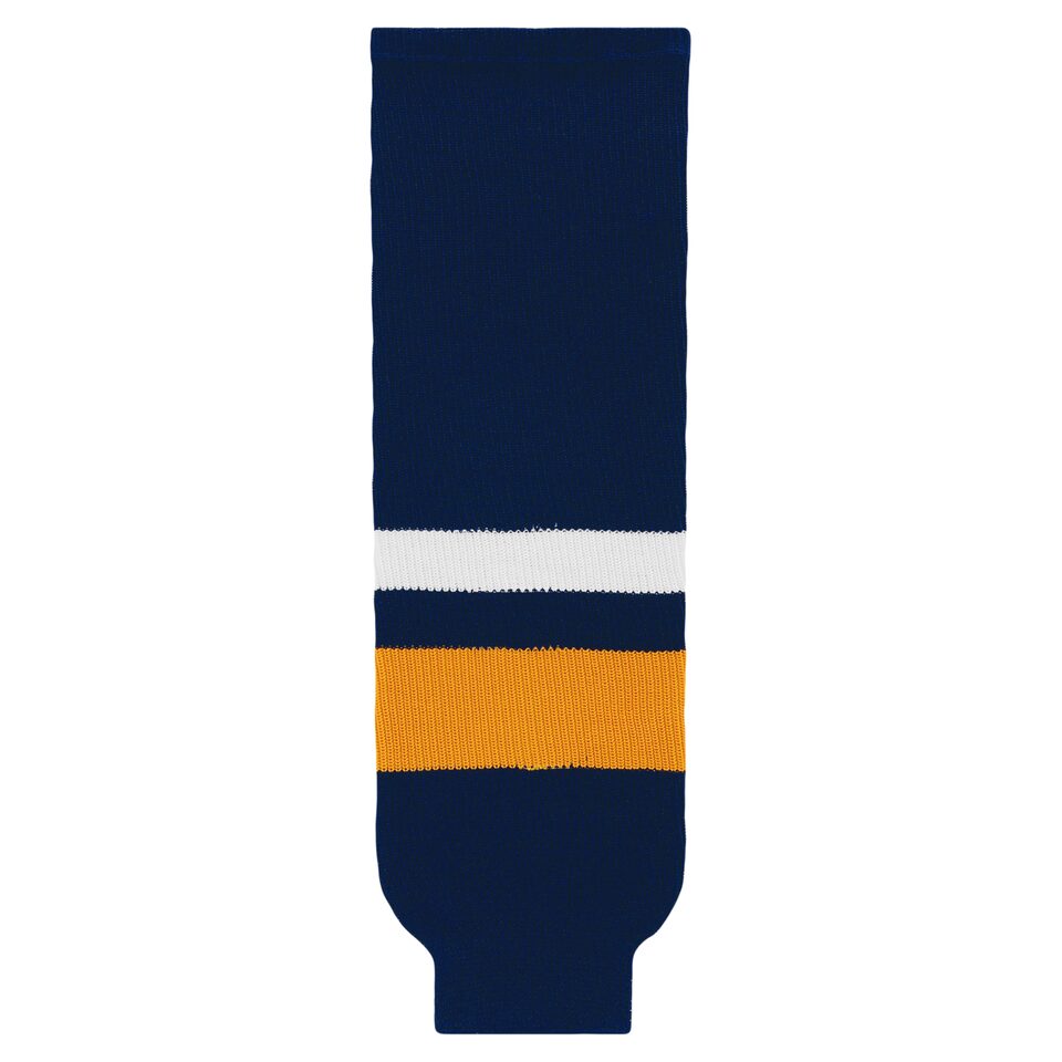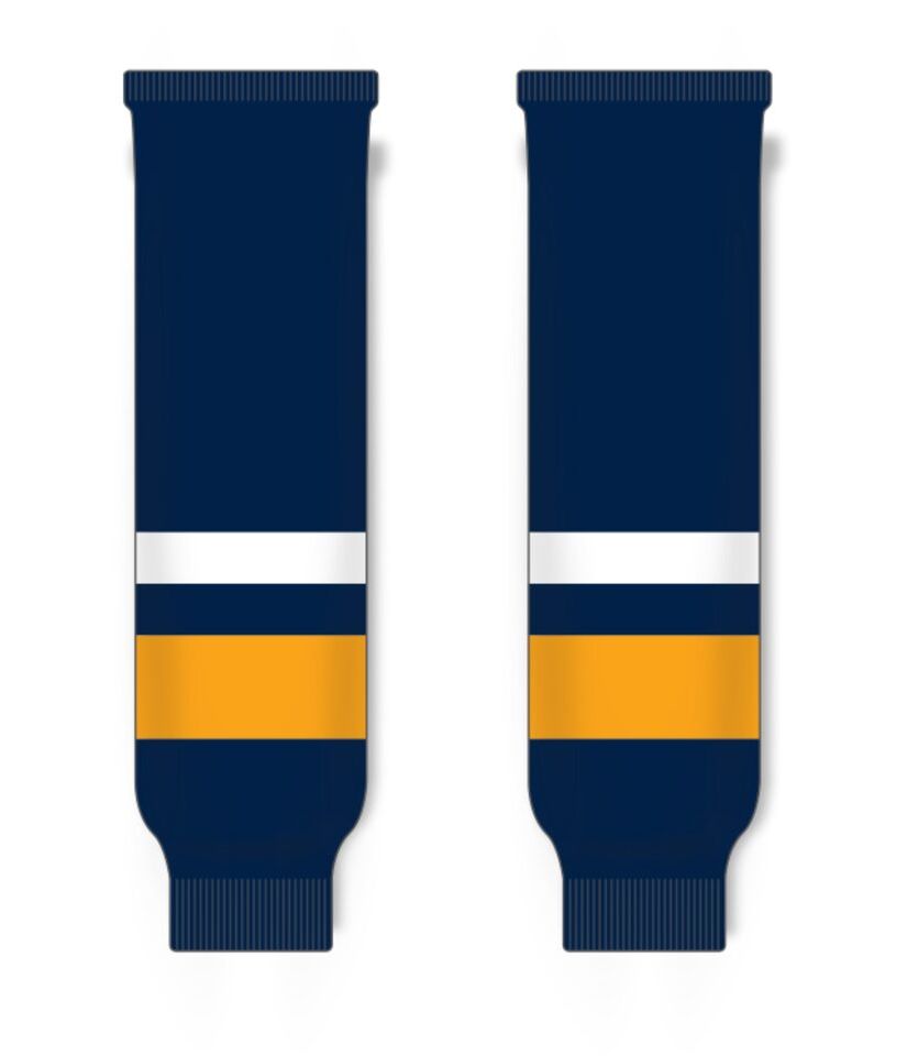 The HS630 Knitted Striped Hockey Socks is made of knitted fabric, for durable hockey socks. These knitted striped hockey socks are 2008 buffalo navy but many other colours are available on our website. They are available in youth, intermediate & adult sizes.