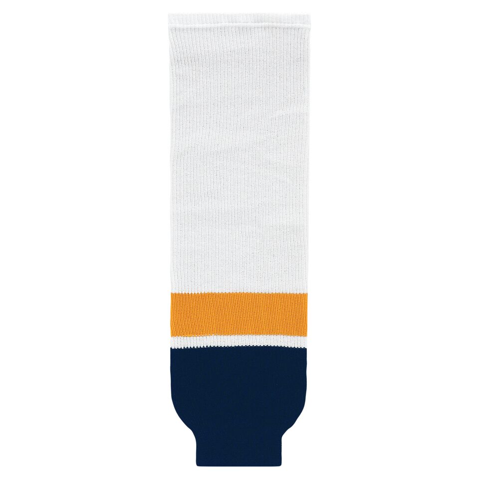 The HS630 Knitted Striped Hockey Socks is made of knitted fabric, for durable hockey socks. These knitted striped hockey socks are 2013 nashville white but many other colours are available on our website. They are available in youth, intermediate & adult sizes.